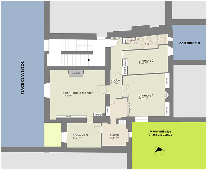 La chambre 1, chambre parentale et la cuisine s’ouvrent sur le calme et la lumière du jardin intérieur du Carré des Clercs. La chambre 2 et la salle de bains s’ouvrent elles sur une belle cour intérieure, très largement en retrait de la rue Lafayette. La chambre 3 et le salon - salle à manger, grâce au double vitrage, isolent phoniquement l’intérieur de l’appartement de l’animation de la place Claveyson. Ouvrant sur des espaces privatifs ou sur la zone piétonne, l’appartement bénéficie d’une triple exposition sans circulation.